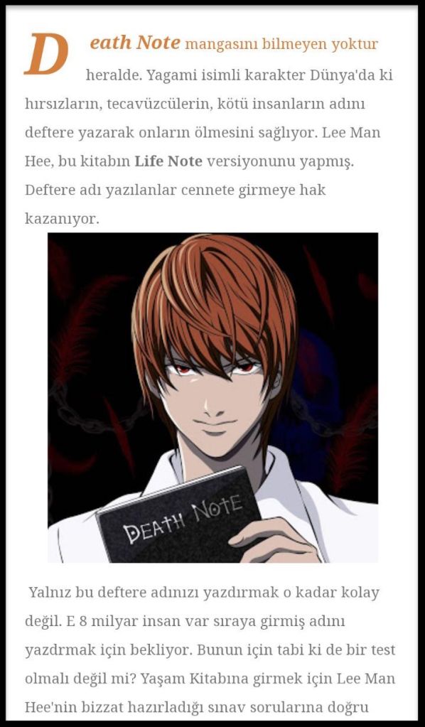 Gerçekten çok anlamsız. Antlaşma Çobanının yaşı 90 ve bir manga kitabını okuyor olması anlamlı mı? Ve bu manga da Japon mangası. Death Note mangasının yazarı ile röportaj yapılmış onu görmüş mü sormak isterim. Death Note yazarı kendi ağzıyla söylüyor kendisi fikirlerini Kutsal Kitab’ın içinden esinlenerek oluşturdum diye röportajında söylüyor. Bu yazıyı yazan ne Kutsal Kitabı biliyor ne Japon kültürünü biliyor kendi keyfine göre internete Shincheonji’nin iyi olmayan yanları diye laf atıveriyor ve kendisinin laf cambazı olduğunu da kendi kendine kanıtlıyor.