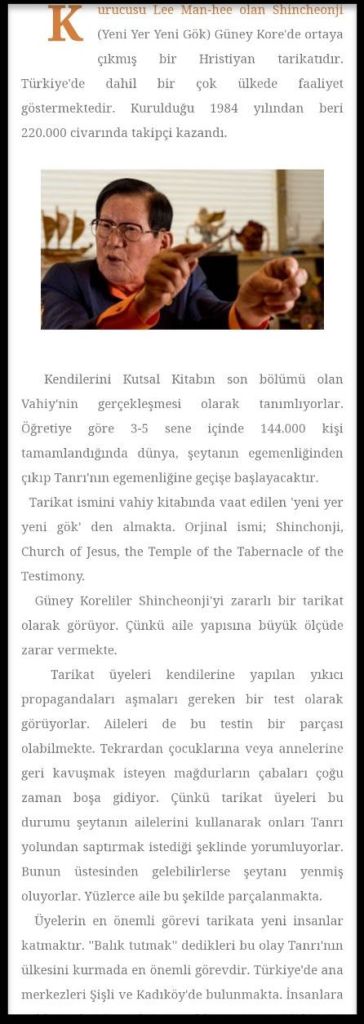 Yazıyı yazan kişinin de cennetin sırrı olarak tanıttığı içerik Kutsal Kitap’ta mecazla yazılmış olan Cennet ve sonsuz yaşamla ilgili olup, mantıksal şekilde öğrenilen bir süreçtir. Din Yaratıcının öğretişidir, insanın yalanları değildir! Sadece inanırsan cennete gideceksin şeklinde olan bir durum değildir. Bütün öğretişlerde kanıt olsun ki din de bozulmaz ve sahte gruplar ortaya çıkmaz. Shincheonji’nin bütün eğitim süreci Kutsal Kitap ve diğer kutsal yazıları kanıt olarak alıp kanıtlamaktadır. Bu sebeple bir çok dini lider Shincheonji’nin sözlerinin doğru olduğunu söylemektedirler. Shincheonji gariptir diye yazılar yazan kişiler gerçekten çok fazla olduğu için sormak istiyorum; Kutsal Kitap’ta bahsedilen tohumun anlamı nedir? Ağacın anlamı nedir? Güneş, ay, yıldızın anlamı nedir? Bu şekilde hakaret eden insanlar tohumun gerçekten ne olduğunu biliyorlar mı? Peki ağaç nedir? Kuş nedir? Ateş nedir? Kandillik nedir? Vaftizci Yahya ne yapmış biridir, neden yapmış biridir? Kutsal Kitabı standart alarak söyleyin. Kendi düşüncesi de değil, başka çobanların yalanları da değil, Kutsal Kitap’ın içinden arayıp bulup lütfen söyleyiniz! Yaratıcı nasıl bir varlık ki bizlere Kutsal Kitap diye gönderilen yazılara bir kanıt bırakmıyor? Evrensel olması gereken bu kitaplar neden günümüz ile alakasız gibi gözüküyor? Hayır. Kanıt bırakıyor ve günümüz ile alakalı olan cevaplar da fazlasıyla var. Peki bizlerin bunları öğrenmek isteyen, aramak isteyen, araştırmak isteyen, Yaratıcı varsa ne yapıyor, nasıl iş yapıyor, neden beni yarattı diyip bulmak isteyen bir yüreği var mı? Bunu düşünmenizi isterim.