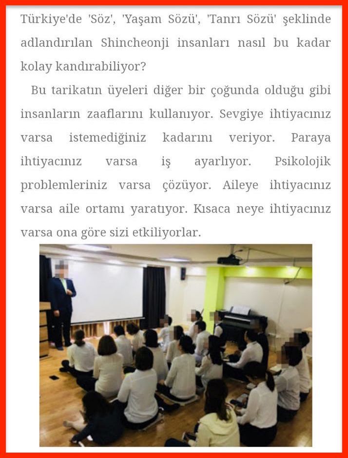Shincheonji bir kişinin ruhunu ihmal olarak İsa’nın sevgisi ve sözlerini ileten bir öğretiş grubudur. (Luka 15:1-10: 99 tane kuzudansa yolunu kaybetmiş bir tane kuzuyu kurtar.) Ruhu yaşatma işi önemlidir, sözü iletme işi gerçekten çok önemli bir görev olduğu için bu yazıda yazıldığı gibi biz de her zaman sevgisi çok ve de aşırı parası olan insanlar olsaydık güzel olabileceğini düşünüyorum. Ancak bizler misyonerlik için minimum maliyet ve dopdolu sevgiyle misyonerlik yaparken yetersiz kaldığımız çok zaman olmuştur. Ve yine psikolojik sorunları olan üyeleri görünce toplumsal hayatları ve aile hayatları için endişeleniyoruz. Bu normal bir okul ya da hastanede de yardım için ellerini uzatmalarıyla aynı durumdur. Bizler de İsa’nın sevgisini gerçekleştirebilmek için bunu yapmakta olup, bu yandaki yazıyı yazan kişi de çeşitli duygular yaşadığını söyleyerek iltifat ettiği için teşekkür ederim. Bütün insanlar duygulanabilsinler diye çaba göstereceğiz. Shincheonji insanları olabildiğince düzgün olmaya çalışırlar ve yaşama tutkusuyla doludurlardır.