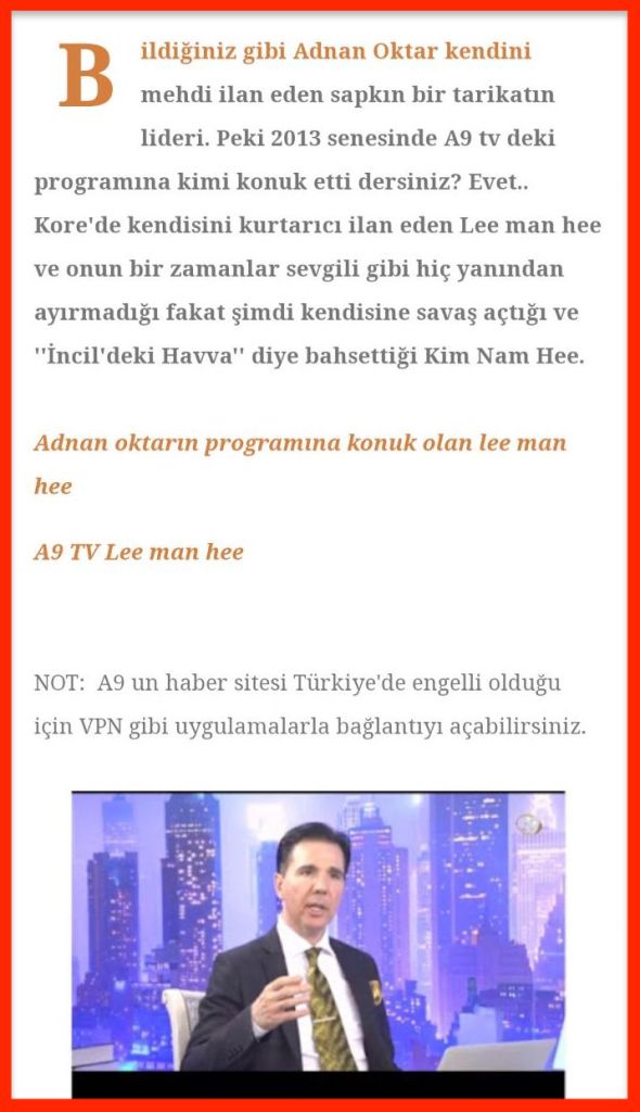 2013 yılında, Adnan Oktar’a dair herhangi bir bilgim yoktu. Shincheonji de Türkiye televizyon kanallarına dair ayrıntılı analiz yapmış bir durumda değildi. TV yayını sonrası Kore’de de bu adama dair birçok problem varolduğunu ve cinsel içerikli bir tv yayını olan bir program sunduğunu sonradan bilmiş oldum. Böyle bir olayın üzerinden kötü söz söylenecek ise eğer bunu biz de kabul ediyoruz. Bu bizim hatamız ve tekrardan böyle bir olayın olmasından ötürü Türk insanlarına böyle bir rahatsızlık verilmeyecektir. Zaten bu olayın sonrasında A9 TV programı ile olan bütün ilişiki kesildi ve şu anda da öyledir. Yine de Kim Nam Hee dediğimiz kadın ile bir sevgili durumu olması tamamen bir iftiradır. Havva diye insanların seslenmiş olduğu da yoktur. Öyleyse Antlaşma Çobanı Adem oldu demektir. Adem Kutsal Kitap’ta iyi ve kötü meyvesini yiyip isyan eden kişidir.(Romalılar 5:12) Kutsal kitabı bilip Adem’in günahını bilen Shincheonji insanı Antlaşma Çobanına Adem, Kim Nam Hee’ye de Havva diye mi seslenecekler? Bu yazıyı görünce buna cevap yazan ben bile kahkaha attım. Bu yazı da yine nasıl Shincheonji bir tarikat grubu gibi görünse de sadece isim karalamak için oluşturulmuş bir yazı olduğunu anlayabiliriz.